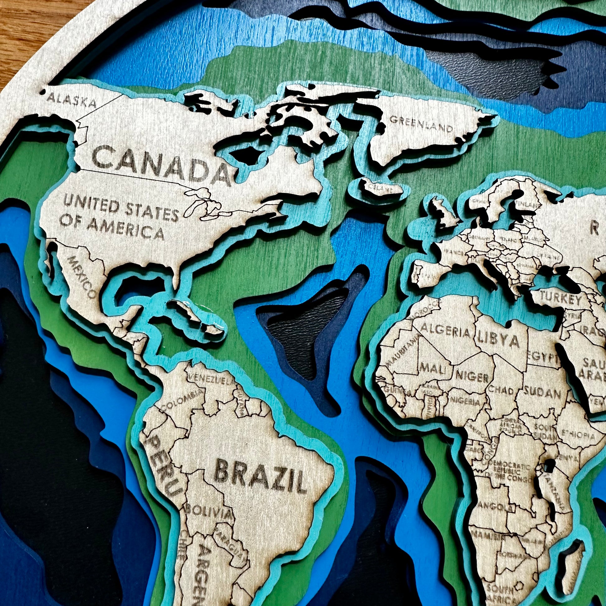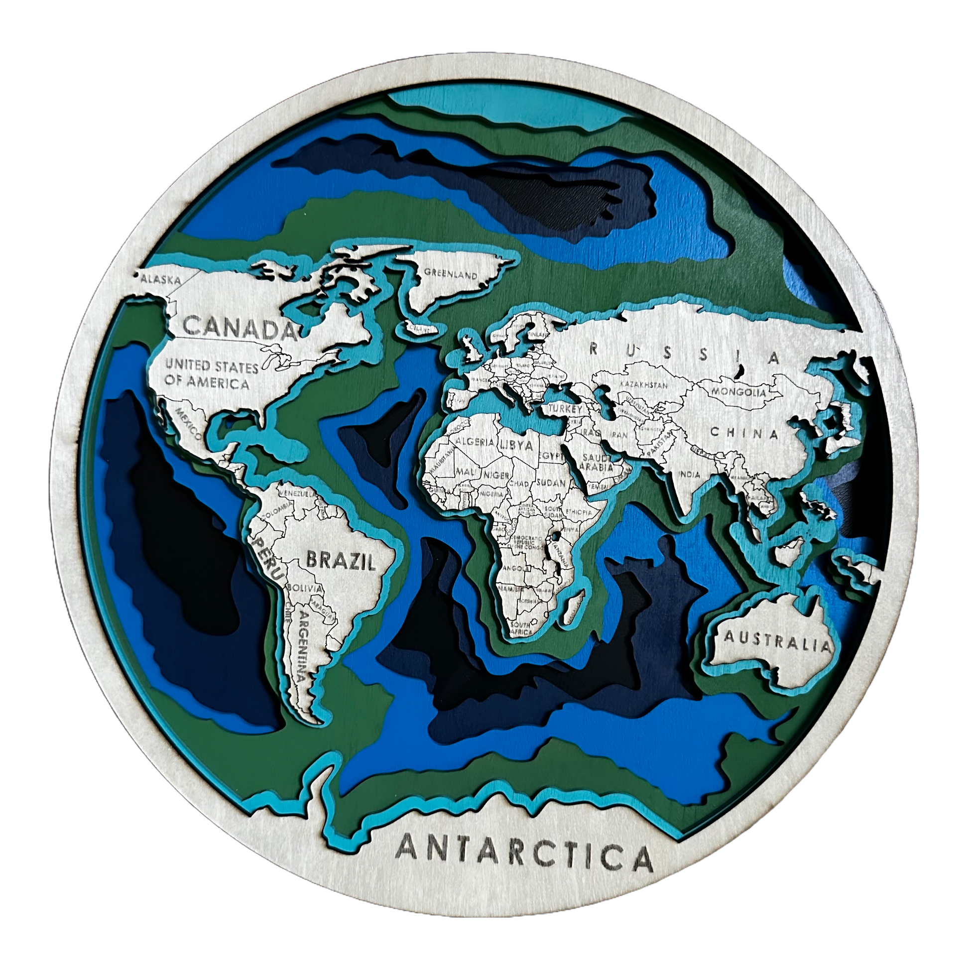 This image depicts a unique 3D map of the world crafted from Baltic birch veneer and custom painted. The continents and major landmasses are intricately cut out, layered, and painted in vibrant colors against a background of deep blue oceans and Antarctica at the bottom.