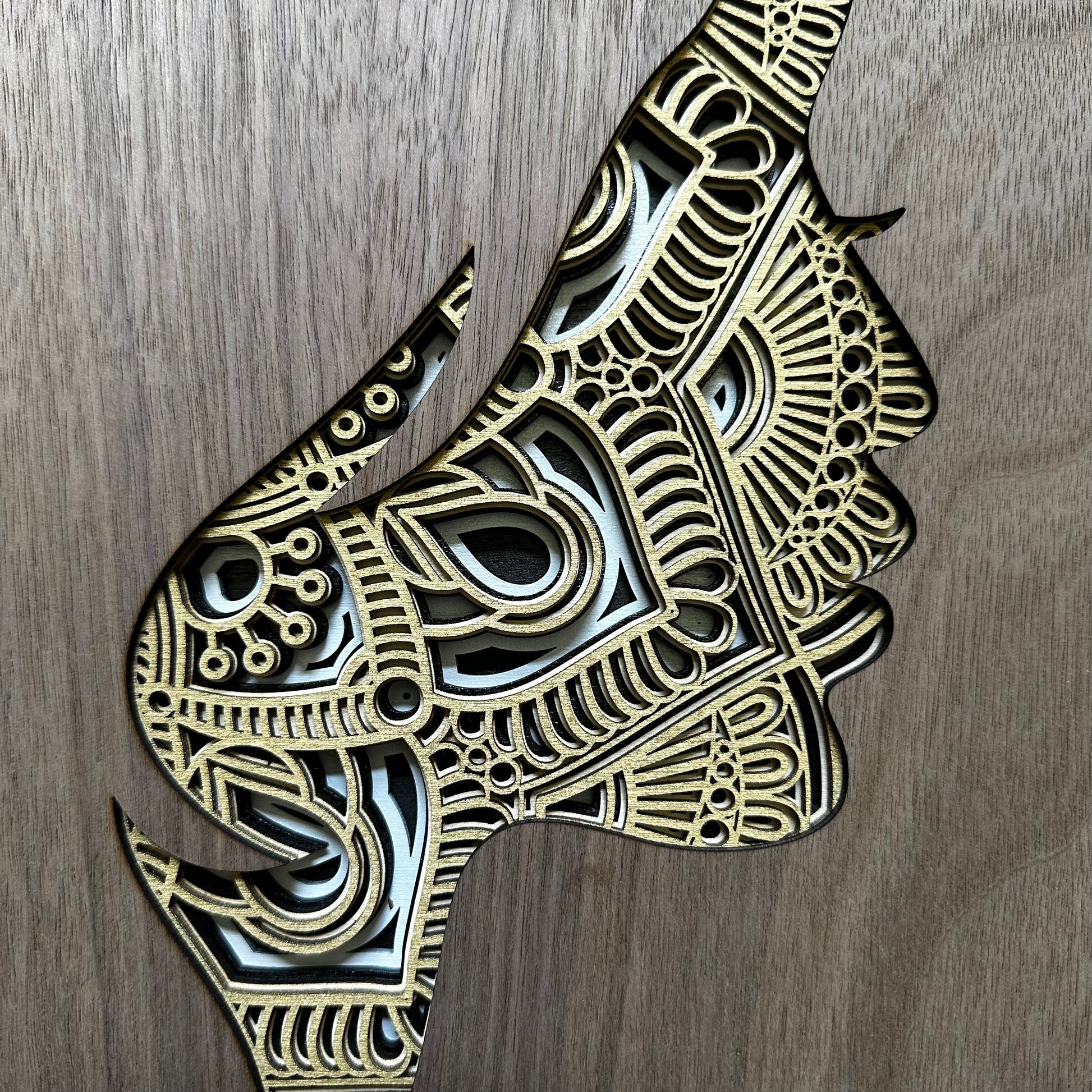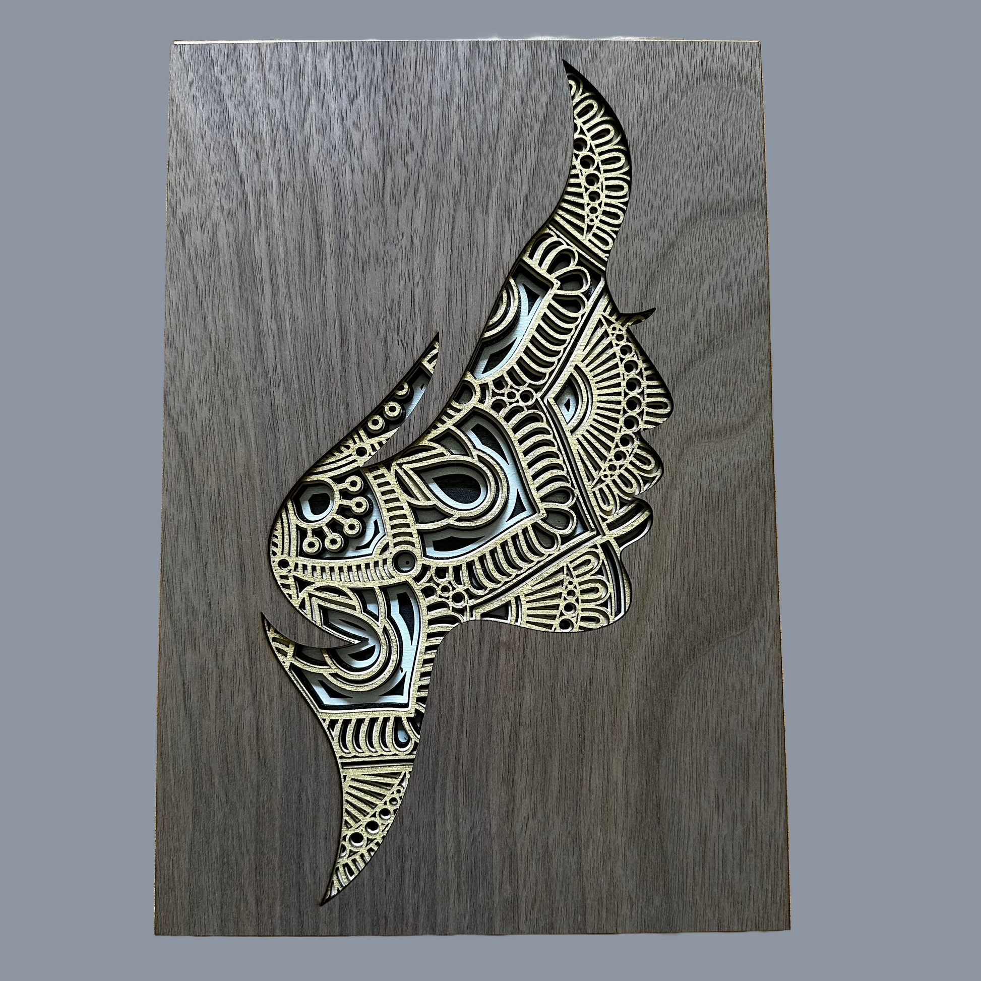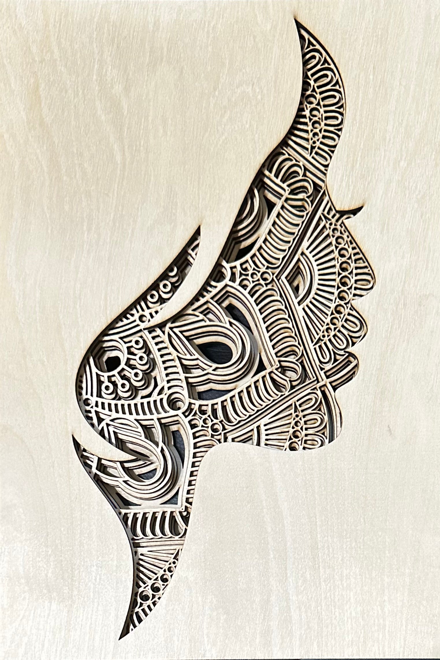 The artwork is crafted from multiple layers of wood veneer, precisely laser-cut and stacked to create a three-dimensional sculpture. The subject is the side profile of a woman's face, accentuating her delicate features with intricate detailing.